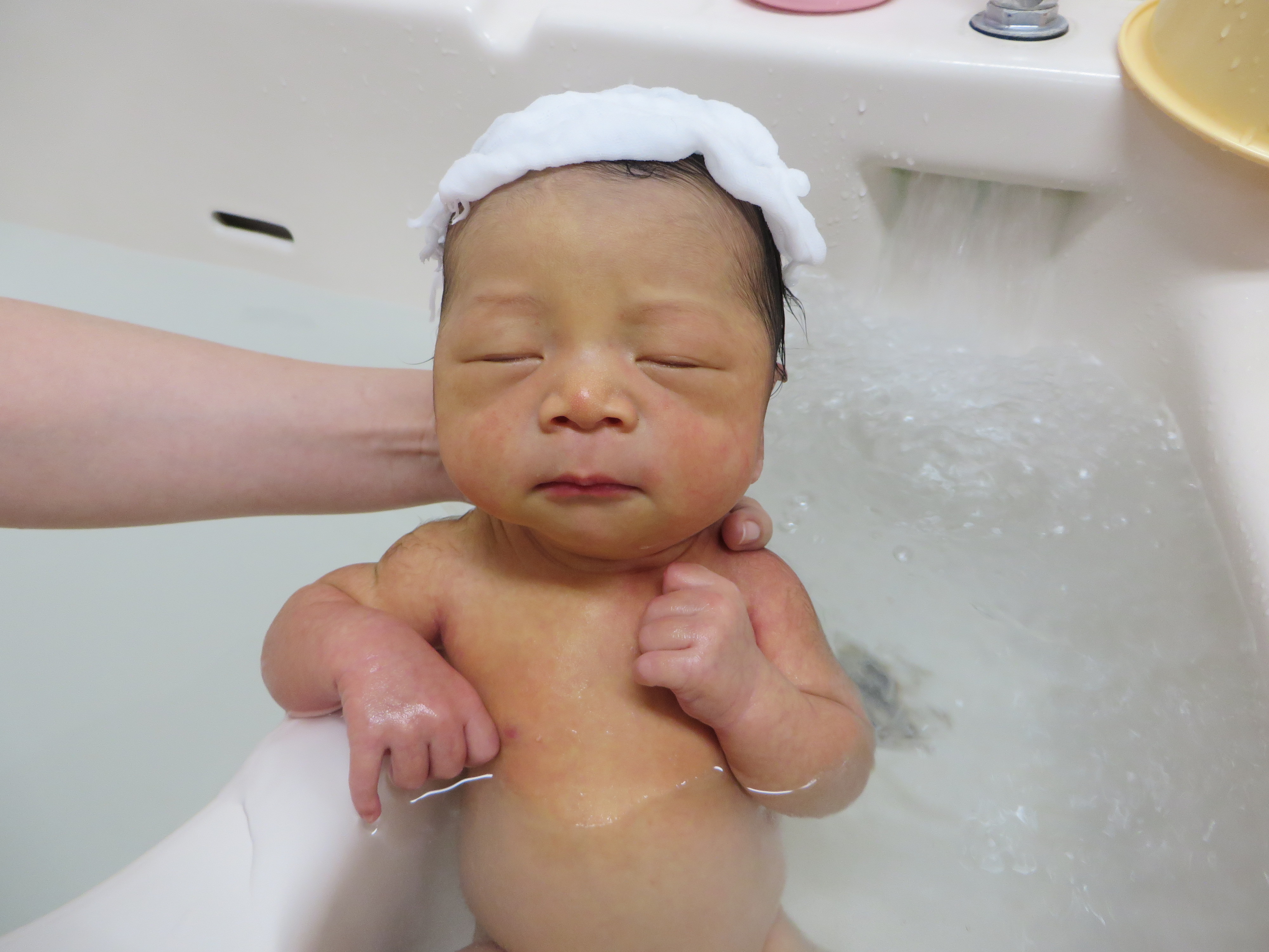 赤ちゃんをお風呂に入れてあげるとき泣いていることが多いのですが、それは裸んぼで寒かったり、洗う時にグラグラ揺れて怖かったり。でもこんなにリラックスした表情を見せてくれることもあります。まるで温泉に入っているみたいですね(^_^)